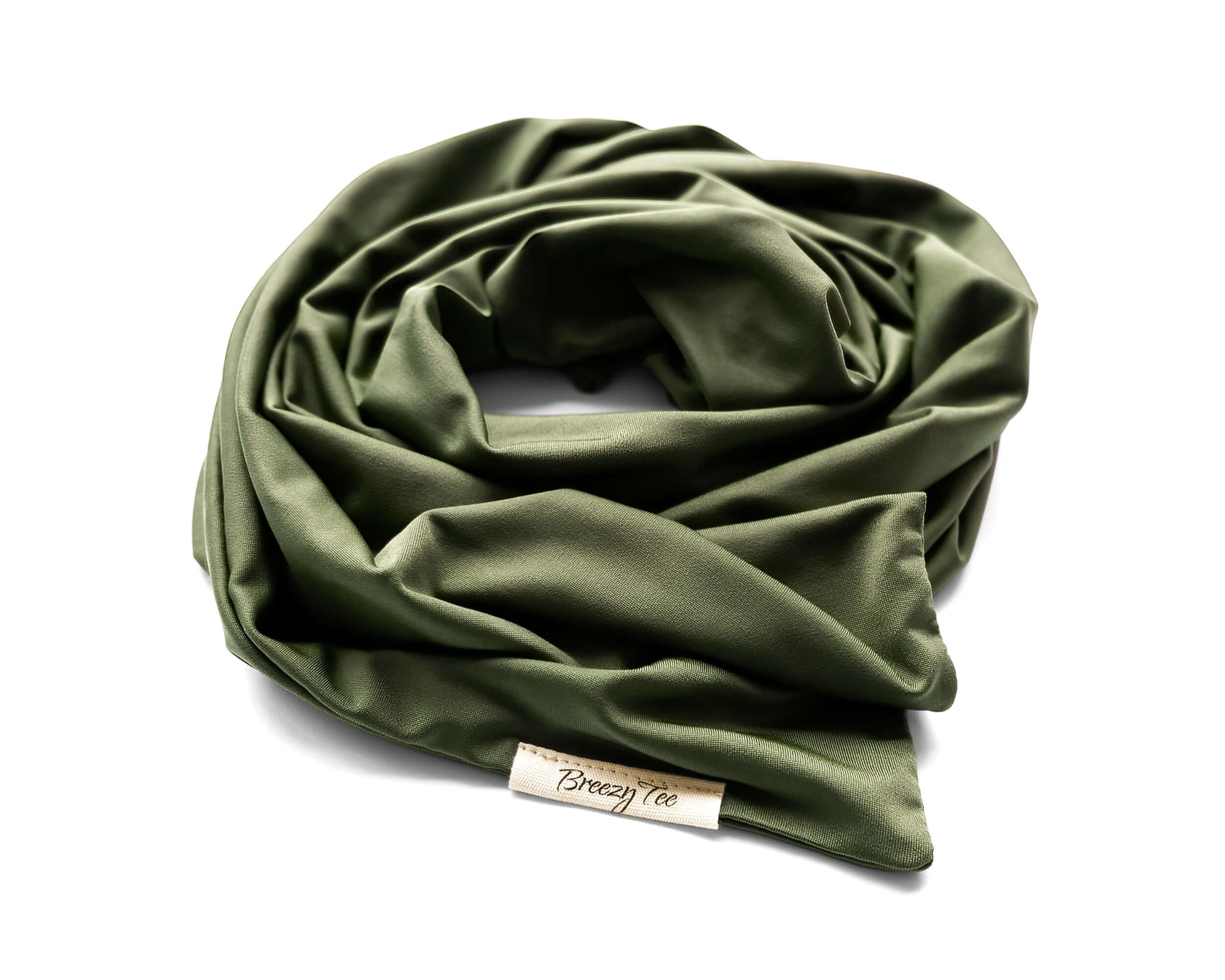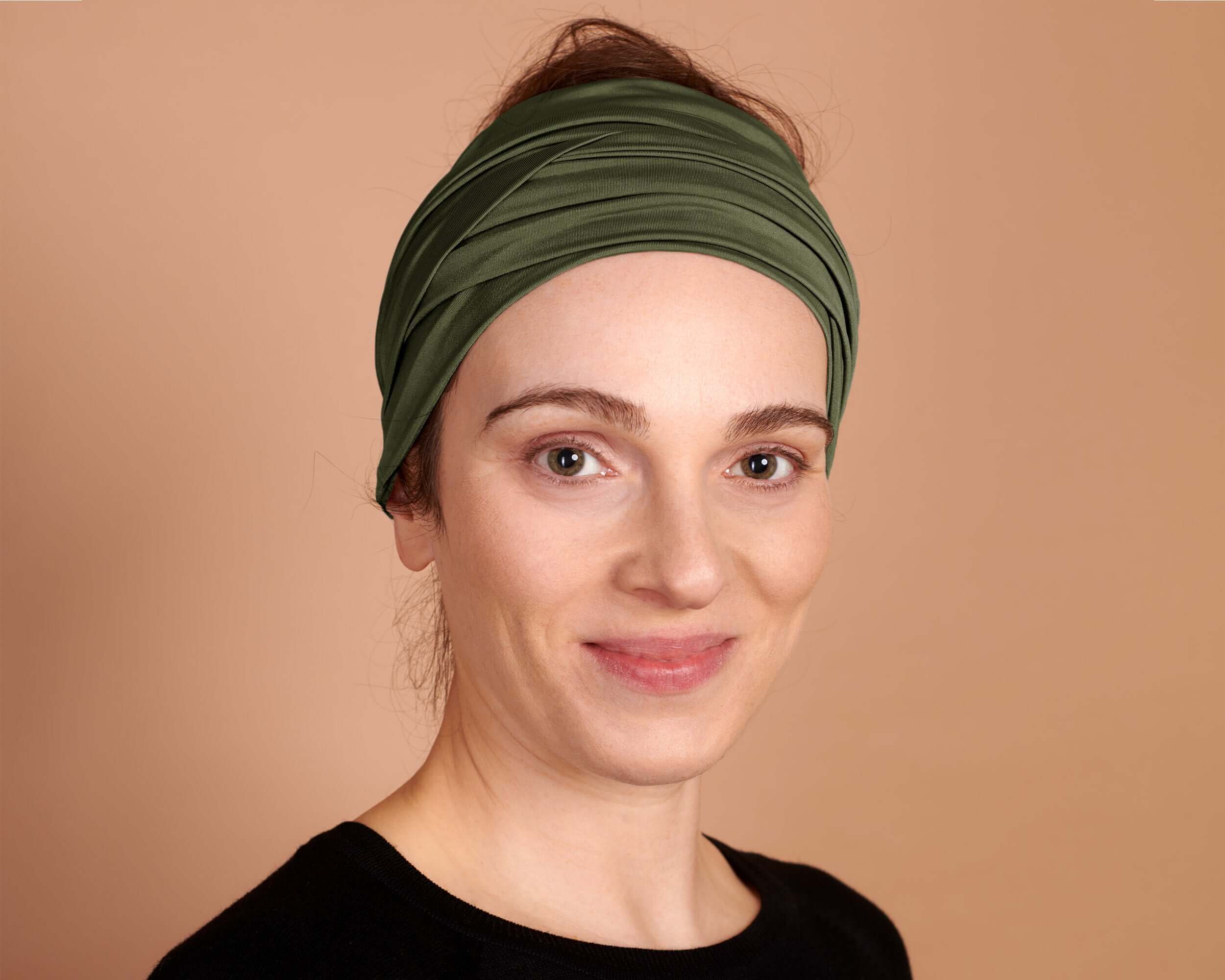 Woman wearing a Boho Head Wrap Wide Hair Wrap in Olive Khaki