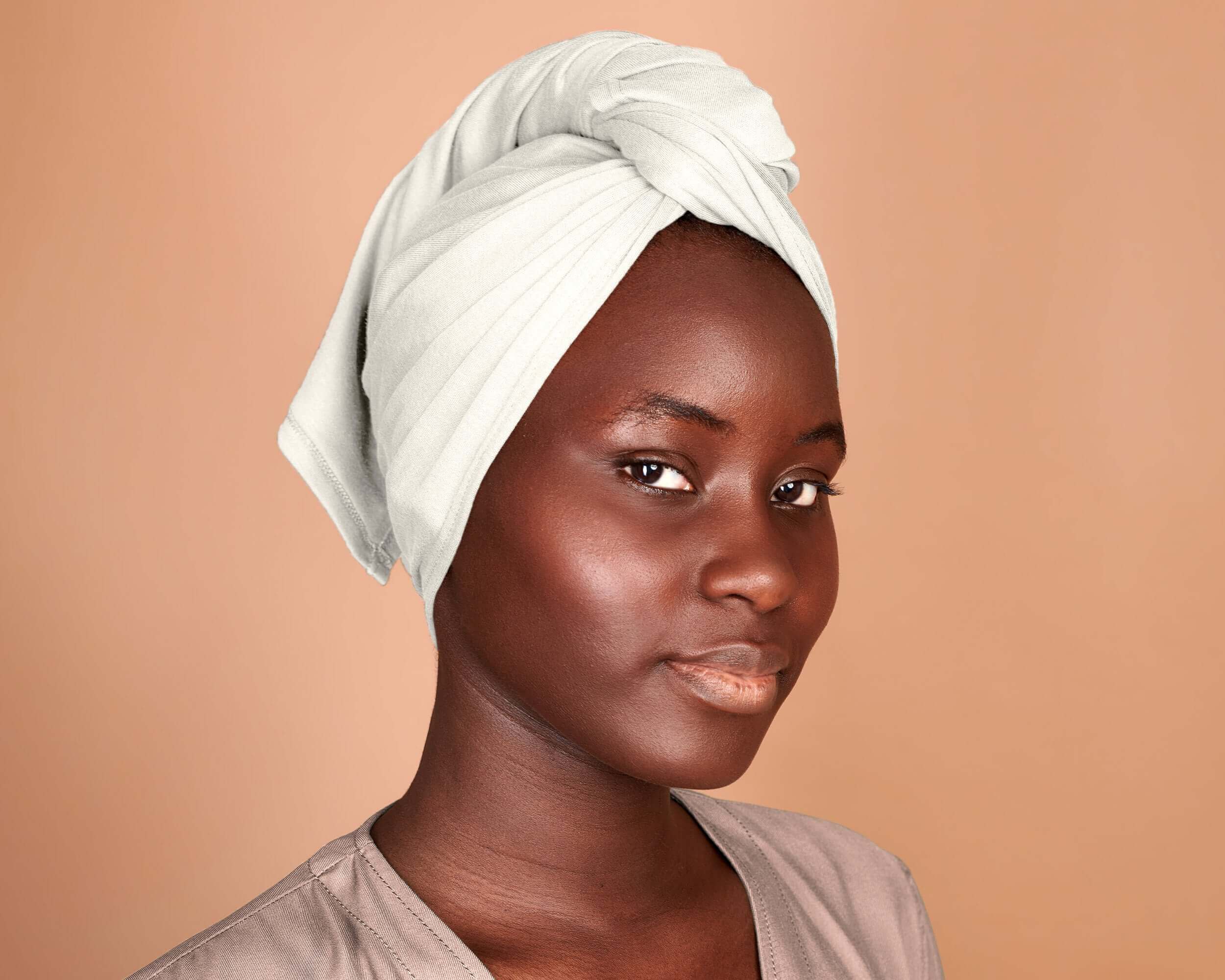 Unser Ivory White T-Shirt-Haartuch ist die perfekte Art, Ihr Haar zu trocknen, ohne Frizz oder Haarbruch zu verursachen, und es ist auch umweltfreundlicher als Mikrofaserhandtücher.