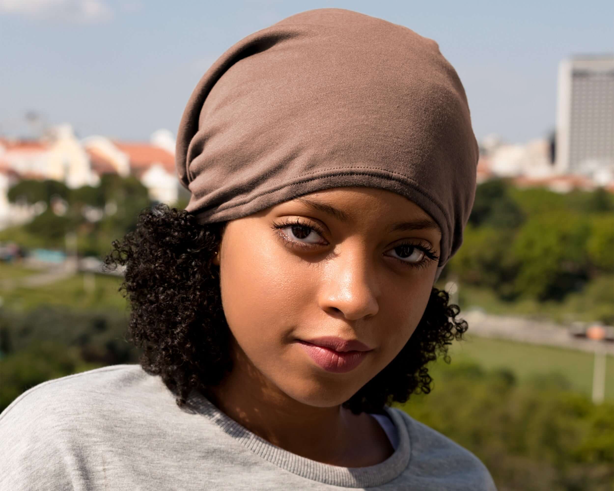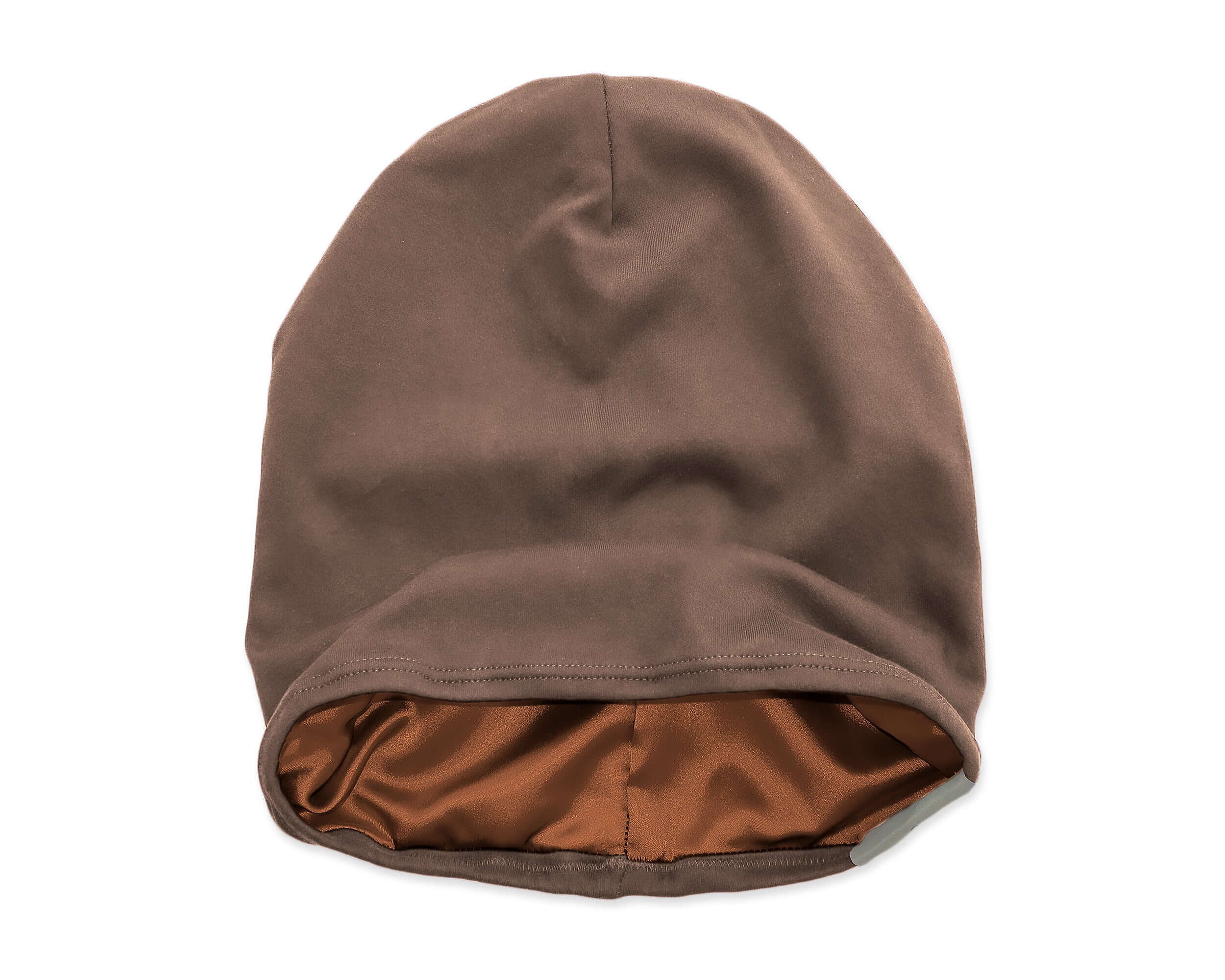 Unsere Mocha Mousse Mütze mit grauem Satinfutter ist die perfekte Möglichkeit, Ihren Kopf warm zu halten und Ihr Haar zu schützen. Hergestellt aus weichem und atmungsaktivem Stoff, ist diese Mütze den ganzen Tag oder die ganze Nacht über angenehm zu tragen. Das Satinfutter hilft, Reibung und Haarbruch zu reduzieren, schließt Feuchtigkeit ein und hält Ihr Haar glatt und frei von Frizz.