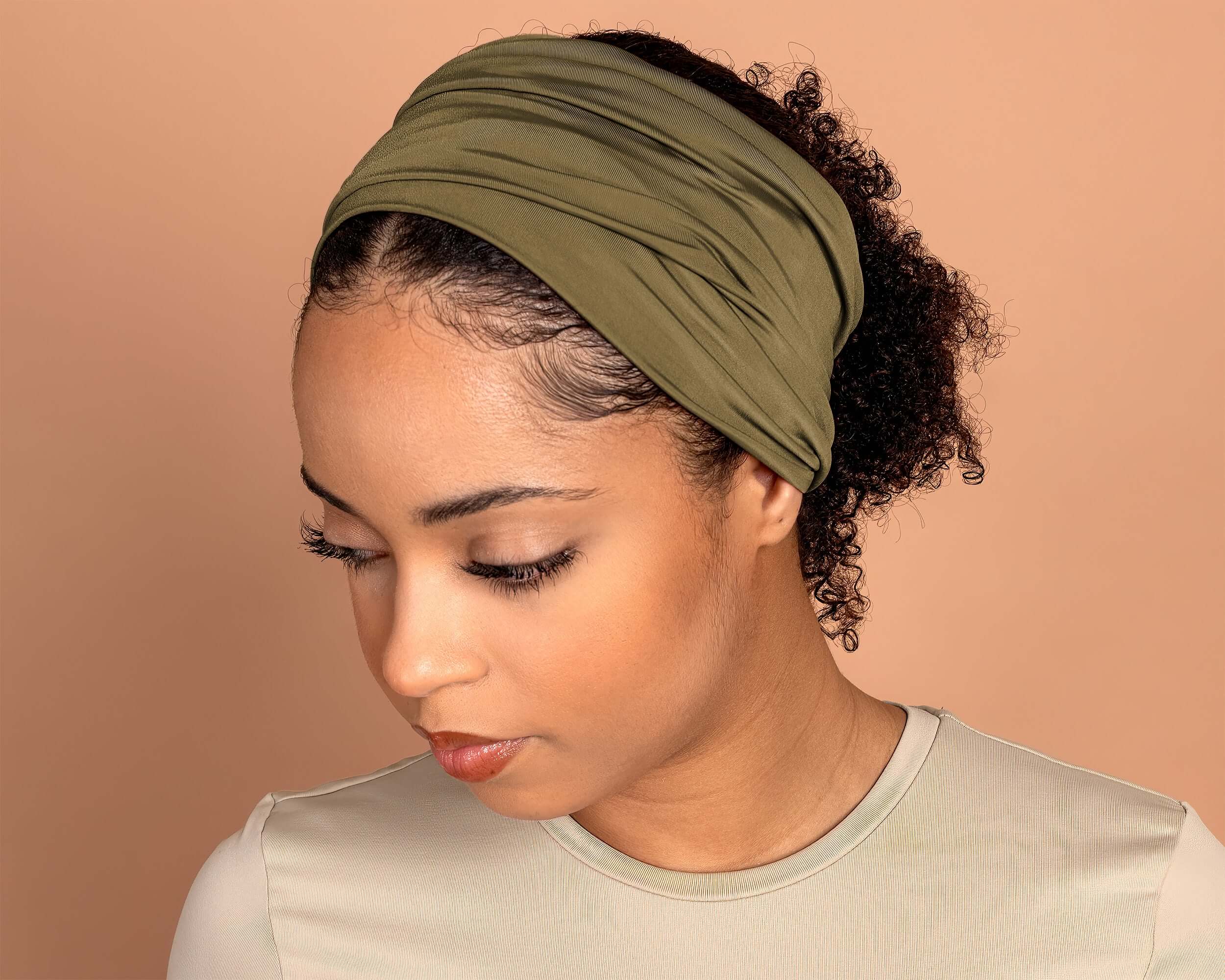 With its double-layer fabric and dynamic stretch, our Khaki Green extra wide Boho headband adds a touch of luxury to any outfit. Adjust the width to fit your style, from lazy hair days to night-time shenanigans, and never worry about size from approximately 7.5” (19cm) wide and circumference 19”(48cm) to 23.5”(60cm). Featured in Teen Vogue, Essence, and more, our chic and versatile headband is perfect for any occasion.