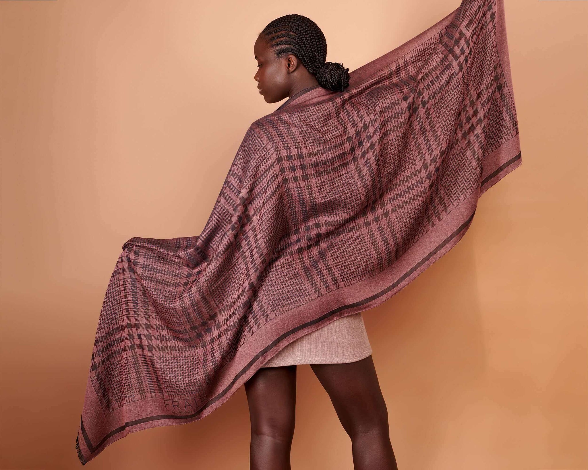 Jacquard Cashmere & Silk Scarf in mauve, showcasing a model draping the scarf elegantly against a neutral background.
