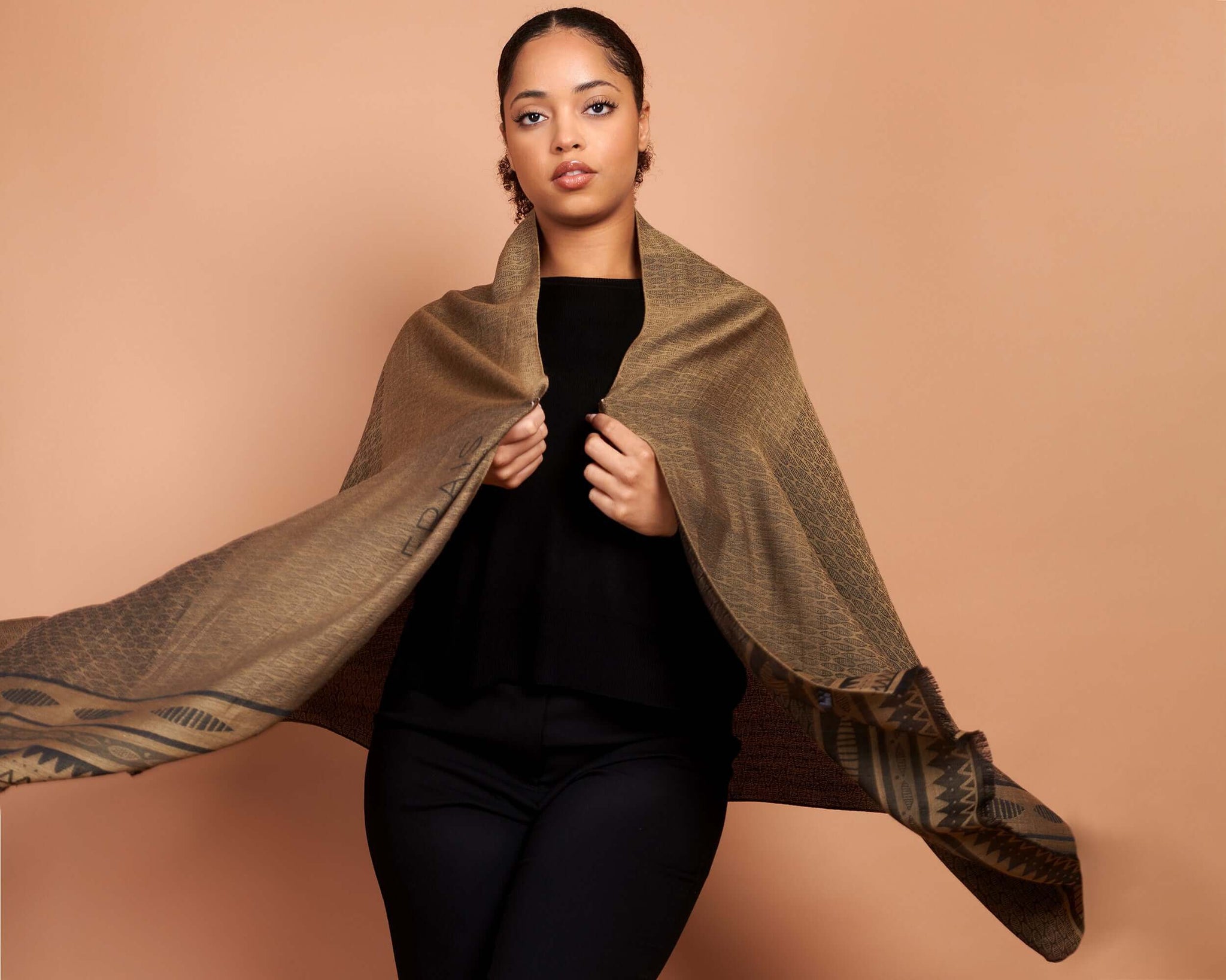 Woman wearing a jacquard silk wool scarf in beige against a neutral background, showcasing its luxurious design.