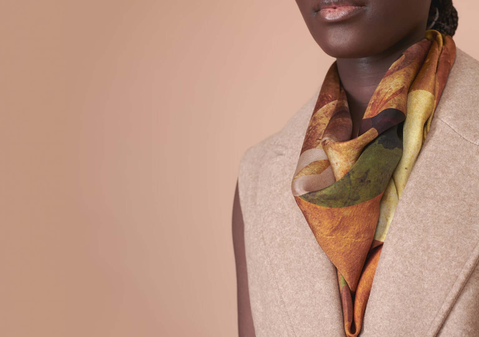 Chaque foulard arrivera dans une magnifique boîte de luxe, fabriquée avec des matériaux recyclés, ornée d'un ruban en poly recyclé post-consommation.