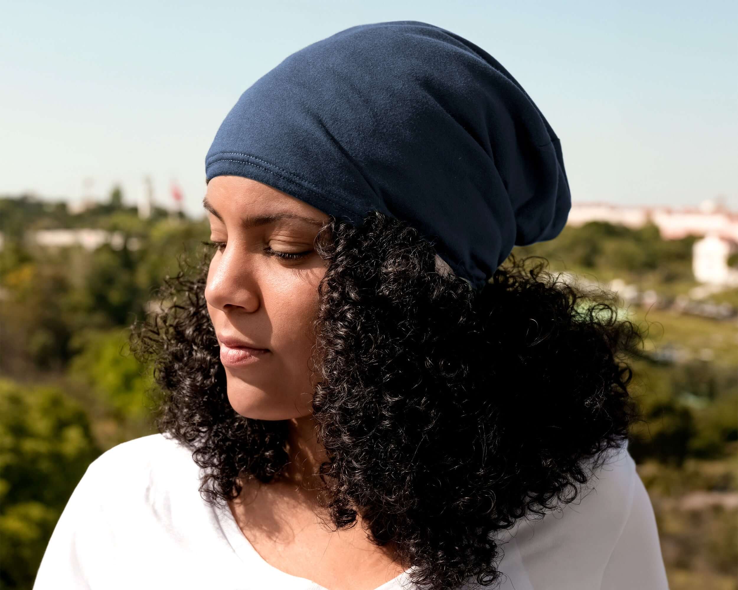 Prova vår marinblå satinfodrade mössa idag och se skillnaden det gör!