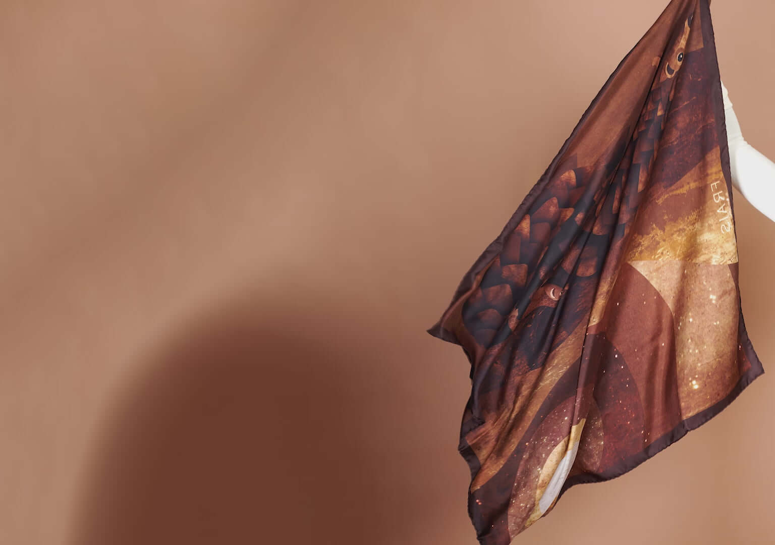 Made In Italy-etiketten och handrullade kanter ger den slutgiltiga lyxstämpeln till våra sjalar. Italien är känt för sitt silk twill-tyg. Så vi ville ha det bästa kvalitetsmaterialet, vilket är anledningen till att våra designer tillverkas i Italien. Att dessutom ha dem handrullade höjer det ytterligare. Det är inte en snabb process, men det ger den mest speciella touchen.