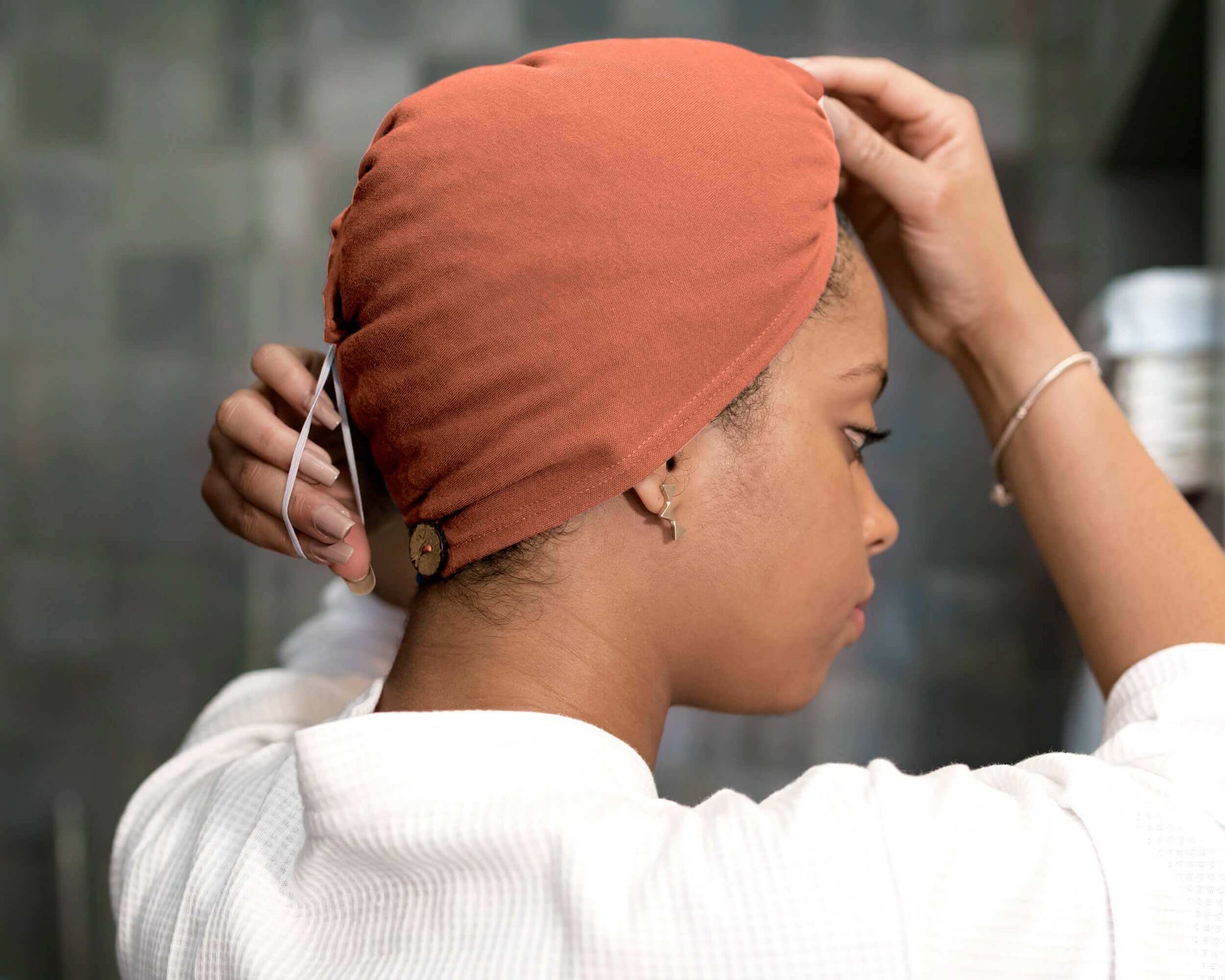 Vår Burnt Orange t-shirt-hårhandduk med huva är det perfekta sättet att torka ditt hår utan att orsaka friss eller skador, och den är också bättre för miljön än mikrofiberhanddukar.